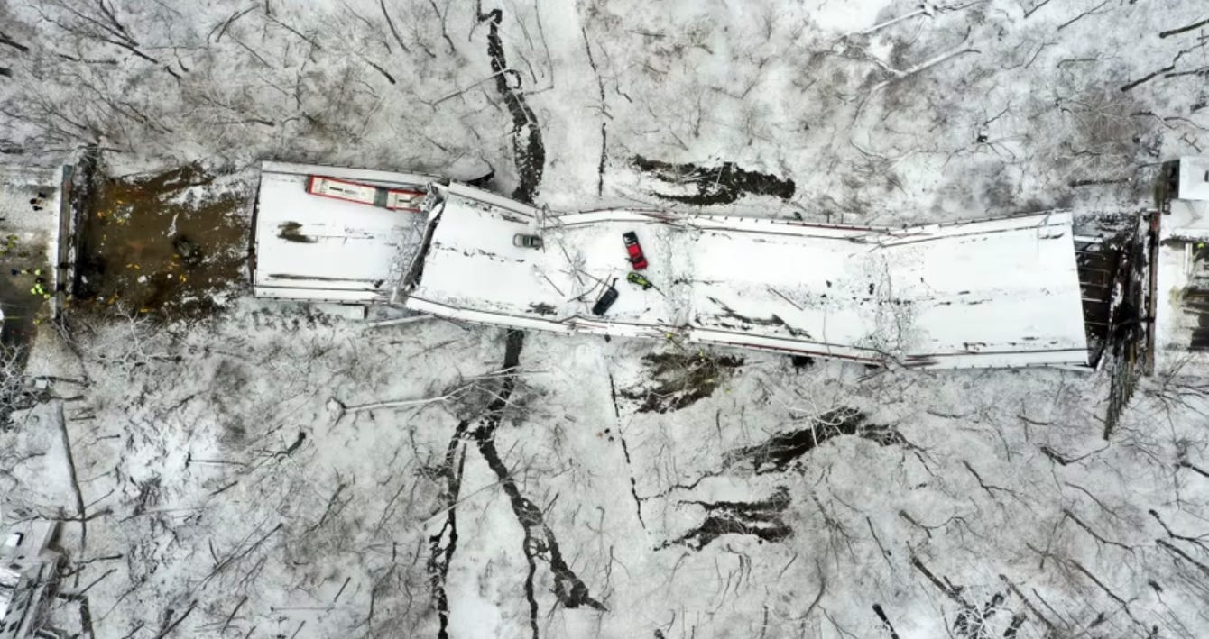 Photo from The Atlantic’s Top 25 News Photos of 2022; vehicles resting on a bridge in Frick Park in Pittsburgh, Pennsylvania following its collapse on January 28, 2022.