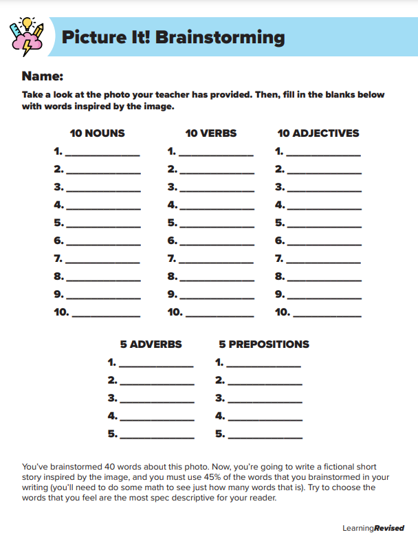 Once you’ve got a photo, project it (or provide it to kids another way) so they can take a close look at it. Have them fill in the page with nouns, verbs, adjectives, adverbs, and prepositions they associate with the photo. I’ve made them come up with 40 words in an attempt to have them stretch themselves a bit and get a little creative in their word choices.