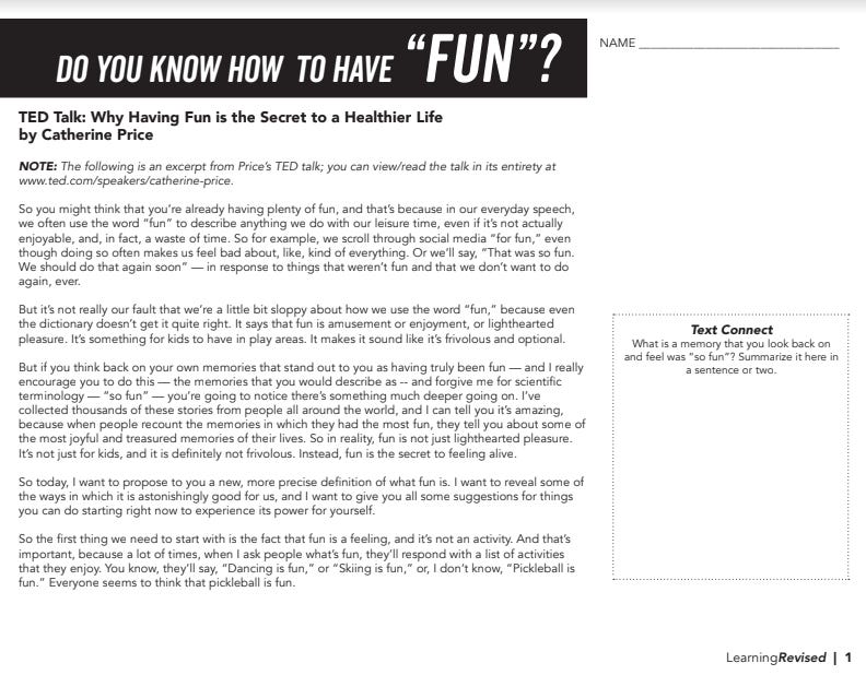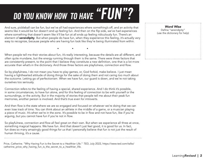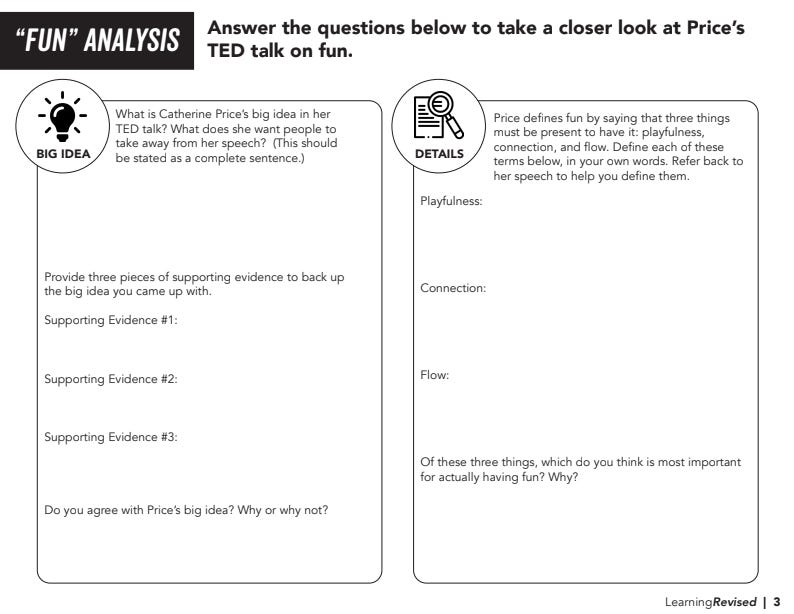 For this week’s resource, I’ve taken excerpts from her TED talk that you can read and analyze with your students. I’ve paired that with some depth & complexity inspired questions over BIG IDEA and DETAILS. All you’ve gotta do is print it out for your students, allow them to read and annotate it, then engage them in some good discussion of the ideas they have about fun and Price’s ideas on it.